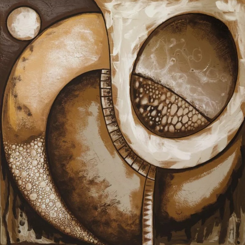 Abstraktes Gemälde, bestehend aus übereinander geschichteten Formen und Texturen in Braun-, Beige- und Cremetönen. Abgerundete Formen und komplexe Muster erzeugen ein Gefühl von Tiefe und Vielschichtigkeit. Die asymmetrische Komposition zeigt überlappende und verflochtene Elemente. Einige Bereiche des Gemäldes sind mit strukturierten Mustern versehen, die an Blasen oder Steine erinnern.