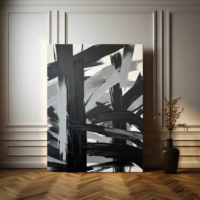 Diese faszinierende abstrakte Malerei vereint kräftige Schwarz- und Grautöne zu einer dynamischen Komposition, die von diagonal und vertikal verlaufenden Farbflächen durchzogen wird. Die expressiven Pinselstriche erzeugen ein starkes Gefühl von Bewegung und Energie, während die wechselnden Texturen und Intensitäten der Farben eine tiefgehende, kraftvolle Atmosphäre schaffen. Ohne einen klaren Fokuspunkt, aber dennoch ausgewogen, zieht das Werk den Betrachter in seinen Bann und vermittelt eine fast greifbare Spannung. Die schattenhaften Farben verstärken die Tiefe und Dynamik, wodurch das Bild lebendig und fesselnd wirkt. Ideal für Liebhaber von Kunst, die Emotion und Energie in minimalistischer Form suchen.