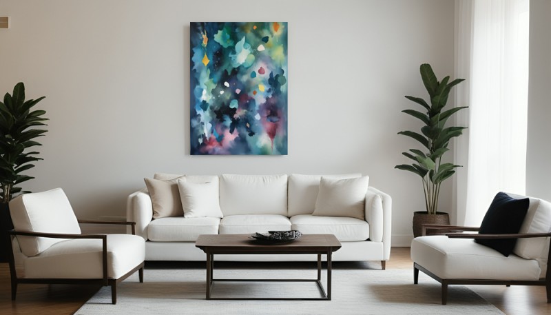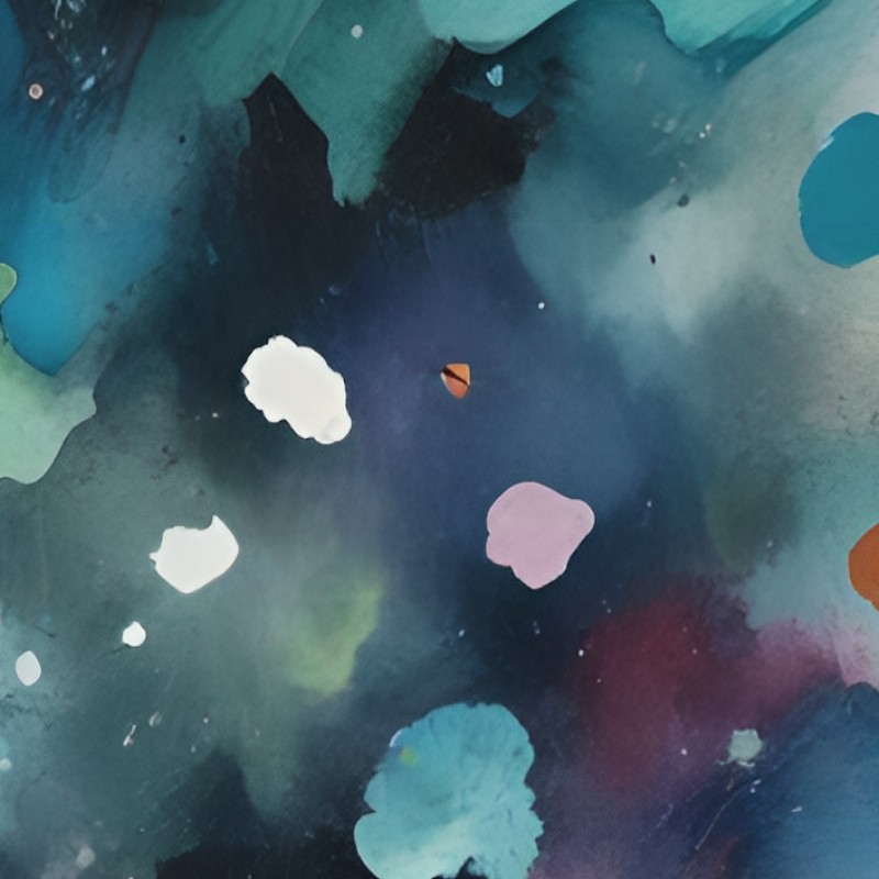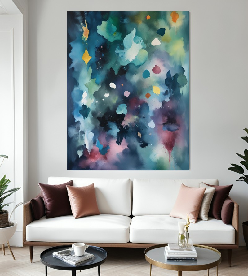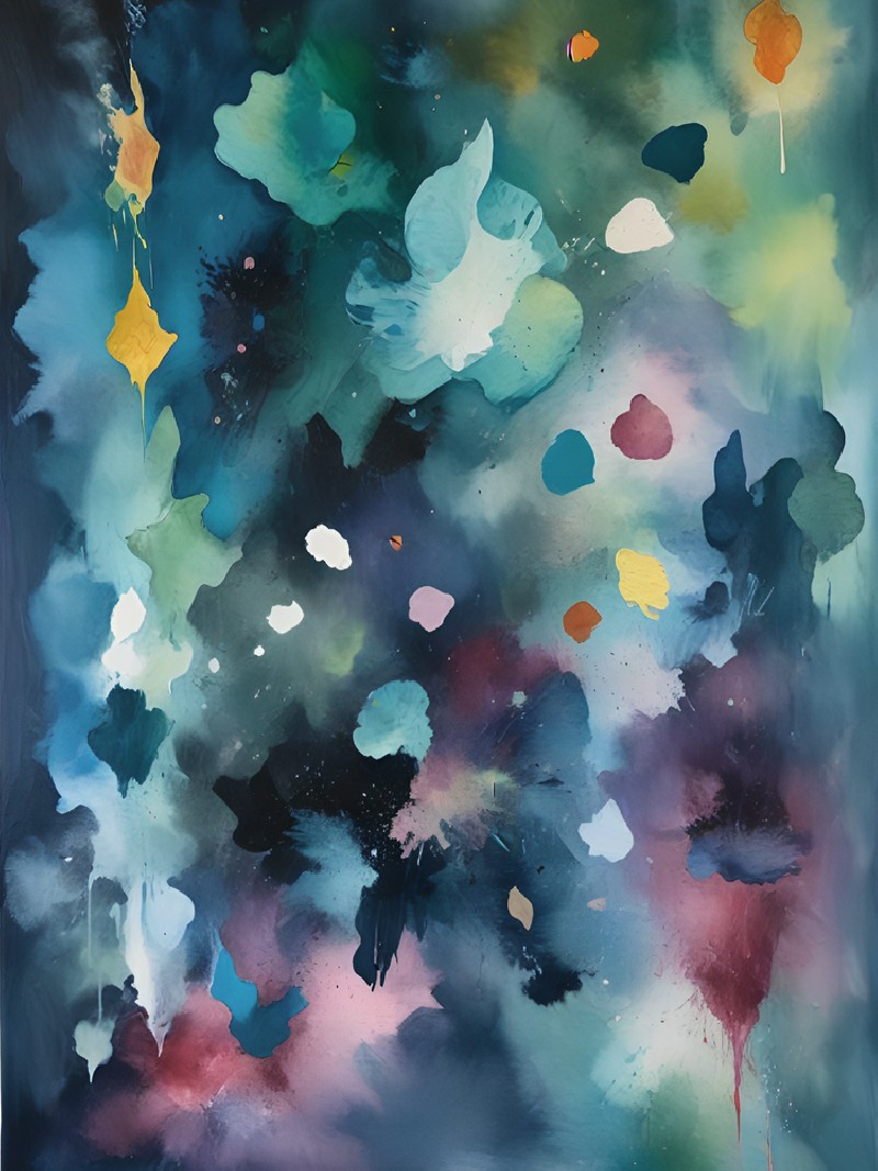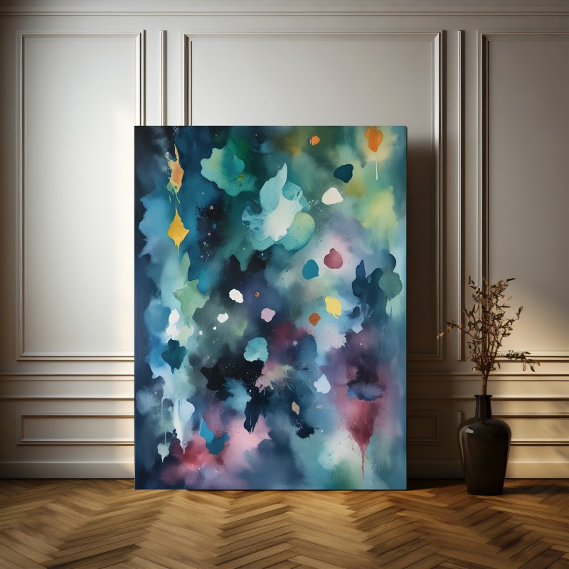 Diese lebendige abstrakte Komposition fängt die Dynamik und Energie von fließenden Farbflecken in kräftigen Blautönen, Grün, Rosa, Beige und Weiß ein. Die Farben variieren zwischen deckend und transparent und verschmelzen zu einer faszinierenden, unstrukturierten Musterung. Die sanften Farbverläufe und die einzigartige Anordnung der Flecken verleihen dem Bild eine Tiefe, die die Atmosphäre von Bewegung und Veränderung widerspiegelt. Das Bild wirkt in seiner Gesamtheit ausgewogen und füllt das Bildfeld harmonisch aus, ohne klar definierte Formen oder Objekte.