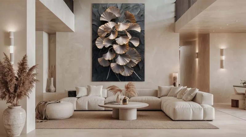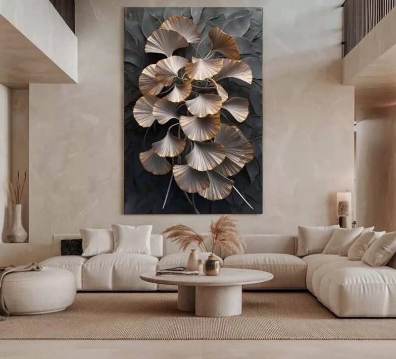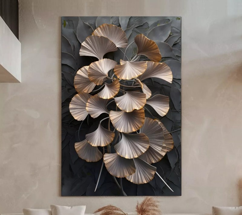 Eine kunstvolle Anordnung von Ginkgo-Blättern in verschiedenen Grautönen, verziert mit goldenen Akzenten, bildet das Zentrum dieses Wandbildes. Die Blätter sind detailreich und in einem geordneten, jedoch fließenden Muster angeordnet, das den gesamten Bildraum füllt. Sie erscheinen in unterschiedlichen Positionen und Ausrichtungen, was dem Bild Dynamik verleiht.