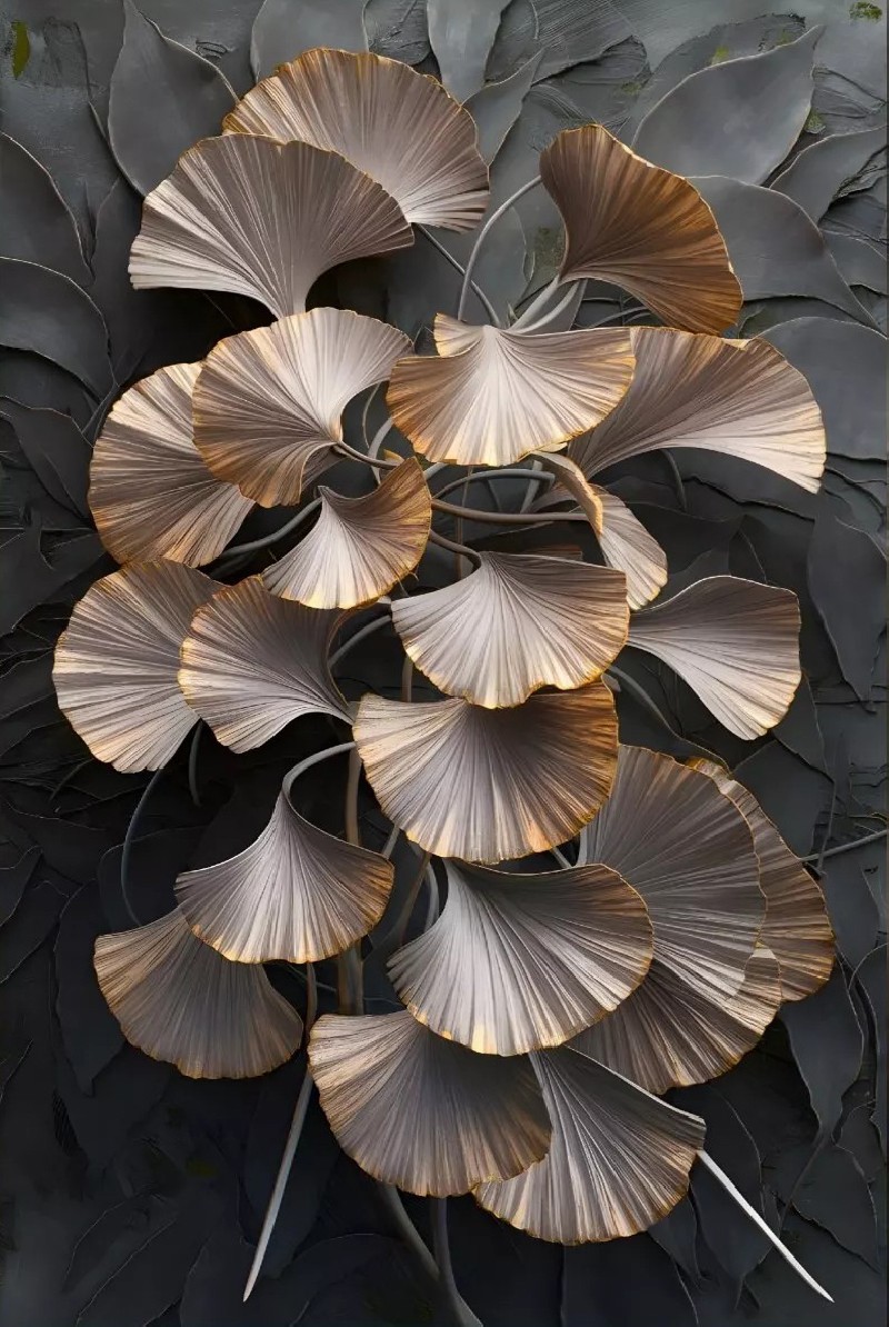 Die Oberfläche der Blätter ist texturiert und ihre Form wirkt lebendig und elegant. Ein dunkles, fast schwarzes Hintergrundmuster aus Farbe und Struktur hebt die Blätter hervor und erzeugt einen ansprechenden Kontrast. Die Perspektive ist direkt auf die Blätter ausgerichtet, was die Details und den raffinierten Charakter des Kunstwerks betont.