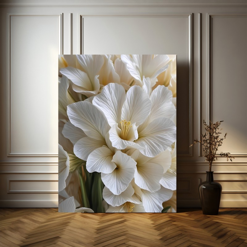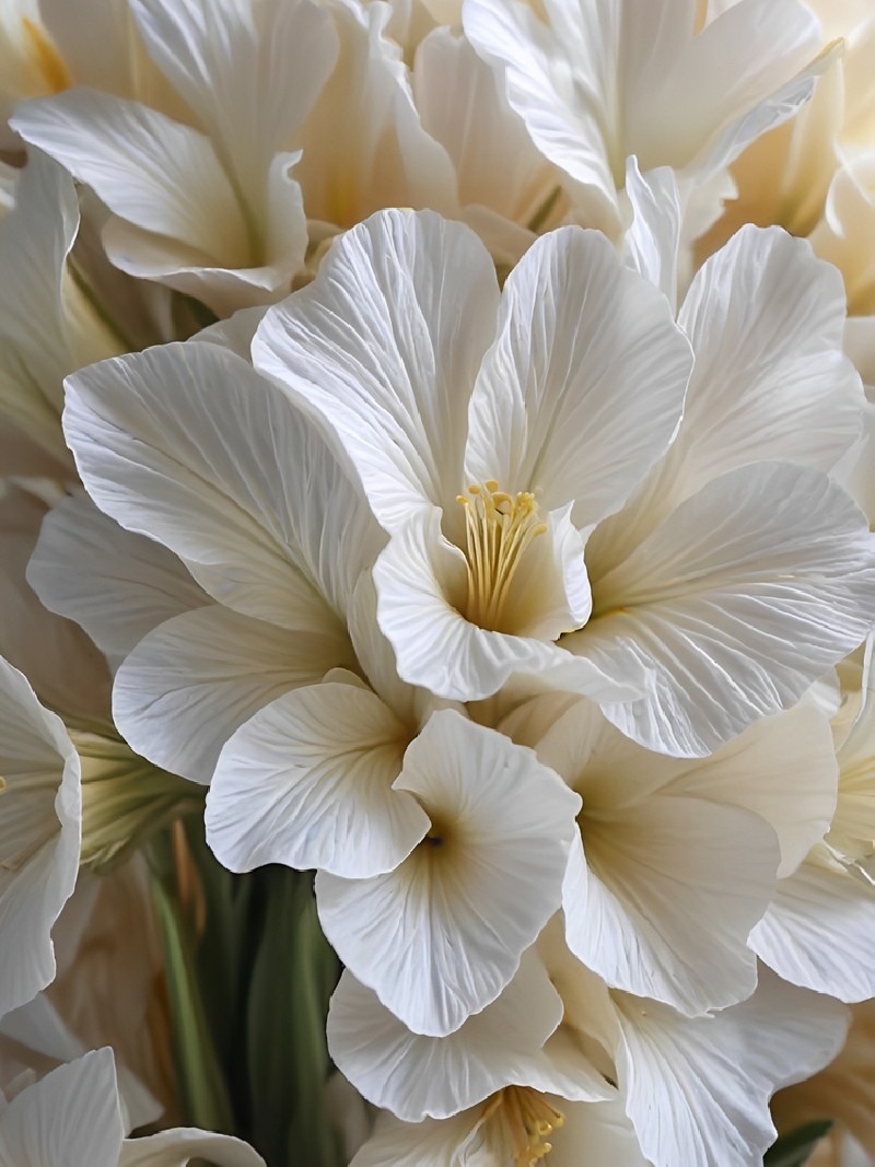 Eine Nahaufnahme eines Straußes weißer Blüten in einem naturalistischen Stil, der die Feinheiten und die Struktur der Blütenblätter betont. Die Blüten strahlen in hellem Weiß mit subtilen cremefarbenen Nuancen, während ihre zarten, leicht gewellten Blätter eine faszinierende Textur offenbaren. Die goldgelben Zentren der Blüten verleihen dem Arrangement einen warmen Akzent. Die Komposition zeigt Blüten in verschiedenen Stadien der Entfaltung, wodurch eine lebendige, dynamische Wirkung entsteht. Gleichmäßiges Licht hebt die sanften Konturen hervor und bringt die organische Schönheit jedes Details zur Geltung. Dieses Werk verbindet Präzision mit zeitloser Eleganz und lädt dazu ein, die stille Pracht der Natur zu bewundern.
