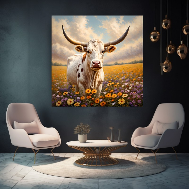 • Titel: Longhorn Rind in einem Feld voller Wildblumen